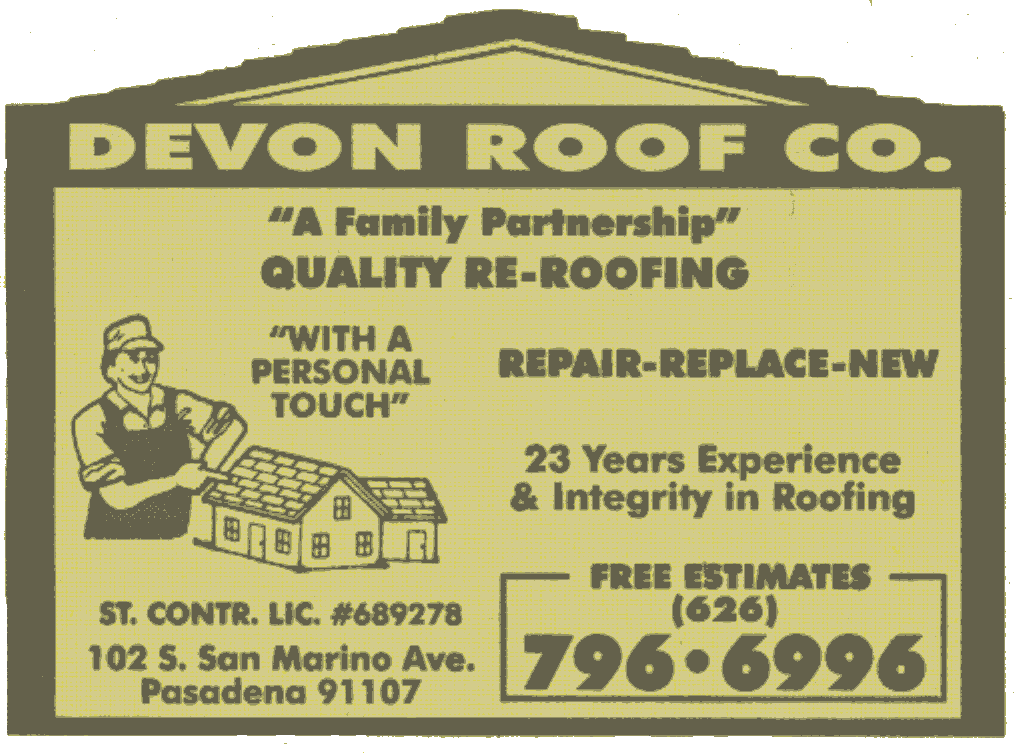 Devon Roof Co. is a family owned and operated Residential Re-Roofing company serving the San Gabriel valley since 1983. It is a partnership of father, son, brother-in-law, and his son. Operating out of Pasadena, we can be reached virtually any time of any day. We have in addition to a Roofing Contractor’s license, a General Contractor’s license enabling us to make repairs or alterations to homes per customers desires or needs. We repair rafters, make pitch changes to flat decks for better drainage, install or repair custom Fascia boards, and install or repair gutter systems. We enjoy challenging jobs, have expertise in two piece Mission tile roofs, and have an excellent list of personal references from professional people and organizations. Our policy is simple: We take the time to do the job right.
